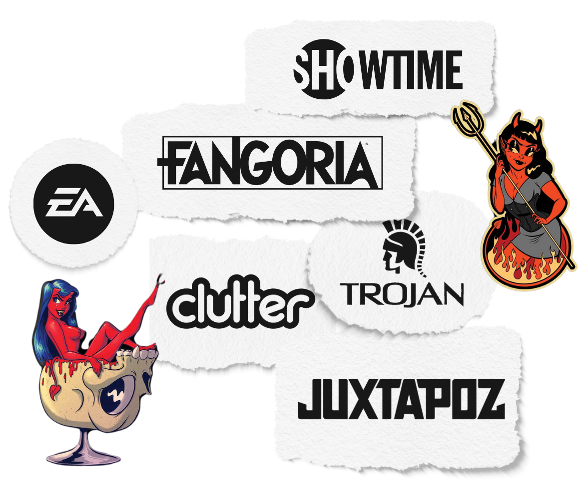 I have been featured in renowned international publications like FANGORIA, Juxtapoz, and Clutter Magazine. And in less renowned publications that would likely get you a stern talking to by your disappointed parents. I have also animated for huge companies that probably regret having my name on the credits like Showtime, EA, and Trojan. Yes, that Trojan. Stay safe kids. You can see my apparel designs on the clearance racks of a few major retailers like Hot Topic, Pac Sun, and Discount Jimmy’s Fun Time Store for Florida tourists.