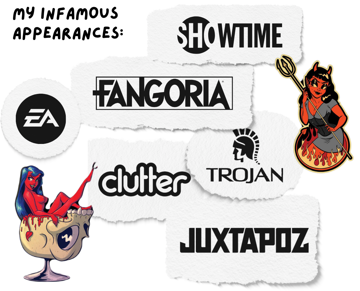 I have been featured in renowned international publications like FANGORIA, Juxtapoz, and Clutter Magazine. And in less renowned publications that would likely get you a stern talking to by your disappointed parents. I have also animated for huge companies that probably regret having my name on the credits, like Showtime, EA, and Trojan. Yes, that Trojan. Stay safe, kids. You can see my apparel designs on the clearance racks of a few major retailers like Hot Topic, Pac Sun, and Discount Jimmy’s Fun Time Store for Florida tourists.