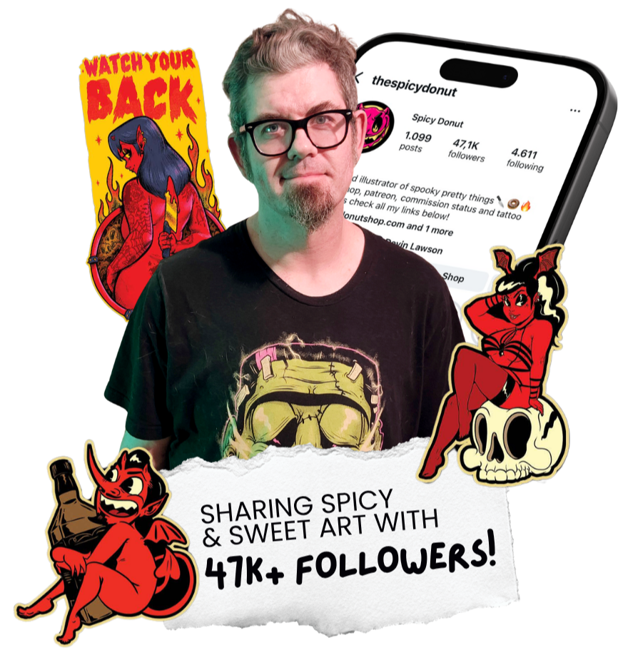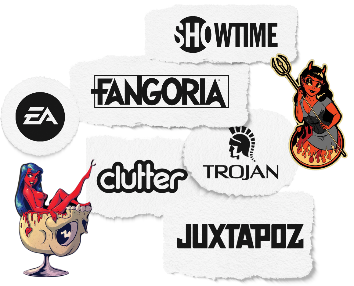 I have been featured in renowned international publications like FANGORIA, Juxtapoz, and Clutter Magazine. And in less renowned publications that would likely get you a stern talking to by your disappointed parents. I have also animated for huge companies that probably regret having my name on the credits, like Showtime, EA, and Trojan. Yes, that Trojan. Stay safe, kids. You can see my apparel designs on the clearance racks of a few major retailers like Hot Topic, Pac Sun, and Discount Jimmy’s Fun Time Store for Florida tourists.